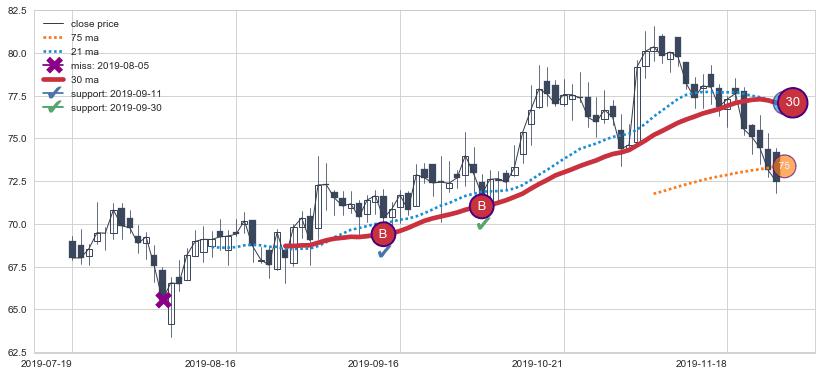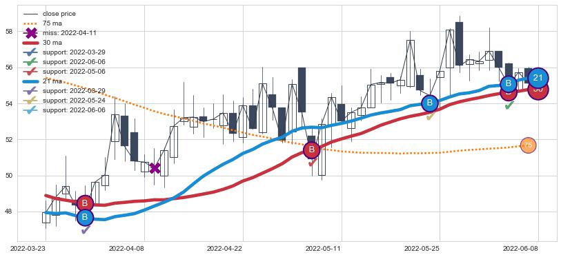 上涨趋势2022-03-23-2022-06-08,均线21, 30确认关键支撑4处
