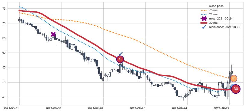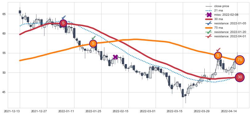 下跌趋势2021-12-13-2022-04-14,均线75, 30确认关键阻力3处