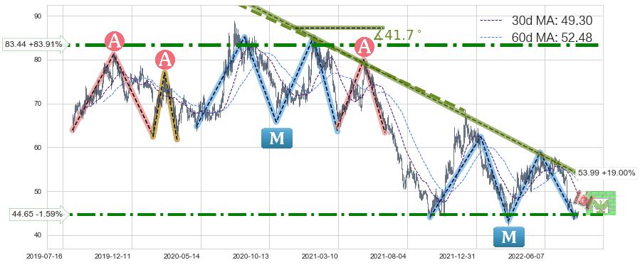 ♘ 阻力价格位44.65,可信任强度74.41%,距离最后交易2022-08-12形成的收盘价格45.37相差 -1.59%
