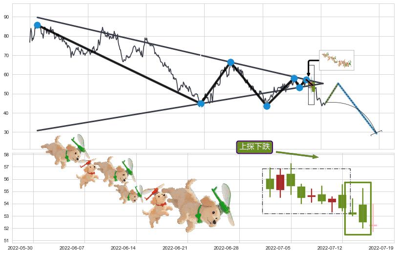| 13 🅚:射击之星形态 ➕ 📐:下降对称三角整理下行突破支撑位破位, 猜想持续下沉下跌,被突破的支撑位已变为阻力位 ☞ 看空信号 ⇥ 【🅚线】交织【图形】⇥ 综合量化分数: 41 | > |