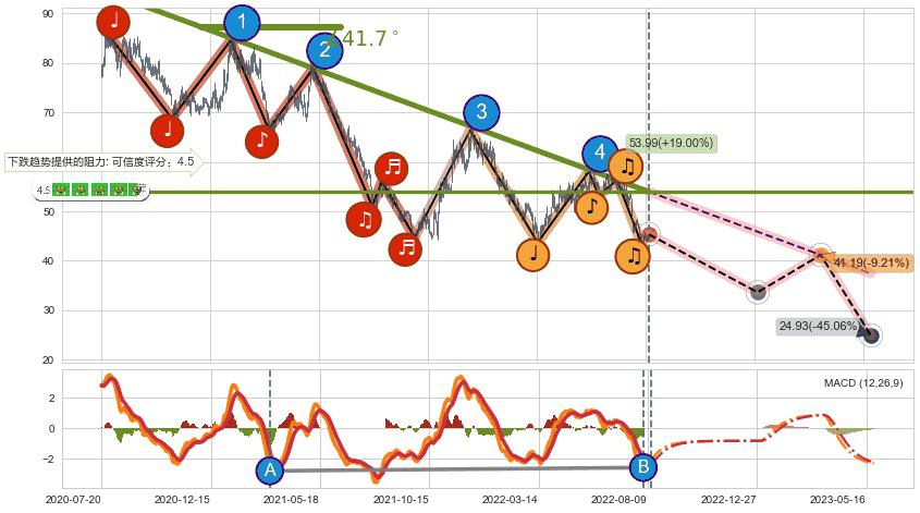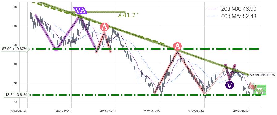 ♘ 在最后的下跌阶段2020-07-29至2022-08-12,存在 持续未破位的阻力位 ,阻力价格53.99,可信任强度88.37%,其距离最后价格45.37相差 +19.00%