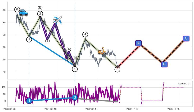 | 2 🅚:【高山滑雪】买入点 ➕ 🌊:波浪理论猜想下跌浪5已形成,猜想后续形成abc反弹上涨(均值回复) ☞ 看多信号 ⇥ 【均线】交织【图形】⇥ 综合量化分数: 52 | > |