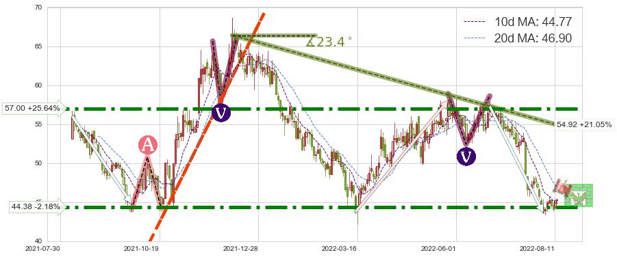 ♘ 阻力价格位44.38,可信任强度89.93%,距离最后交易2022-08-12形成的收盘价格45.37相差 -2.18%