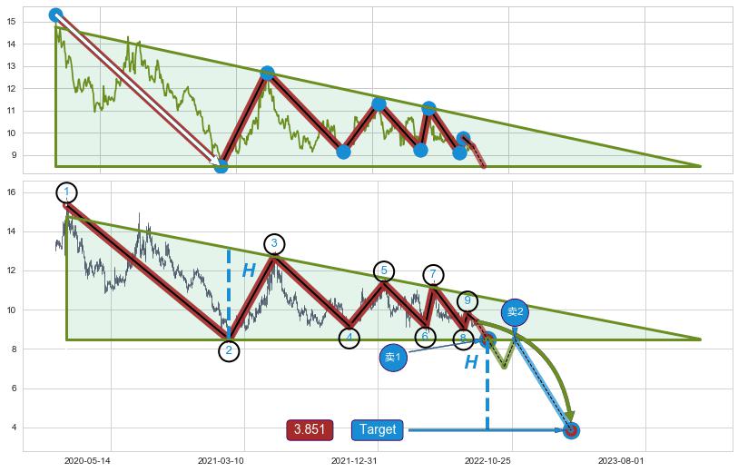➣ 【未确认突破,预测即将形成突破】下降三角形整理起点:2020-02-06, 预测突破点:2022-09-05,形态共631交易日