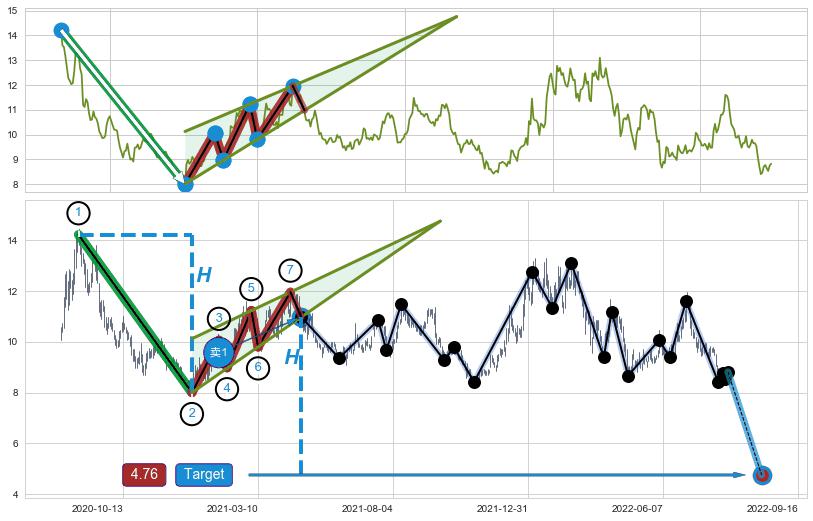 ➢ 最小中继整理跌幅→𝐇: 6.22 (𝐇楔型旗杆的长度:楔型起点→顶点)