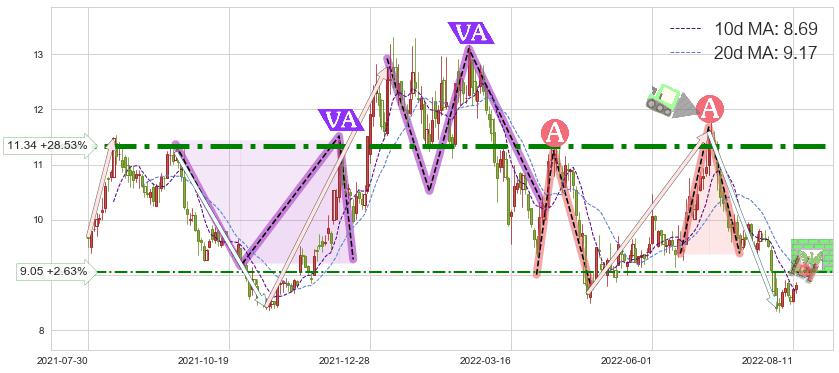 ♘ 阻力价格位9.05,可信任强度46.36%,距离最后交易2022-08-12形成的收盘价格8.82相差 +2.63%
