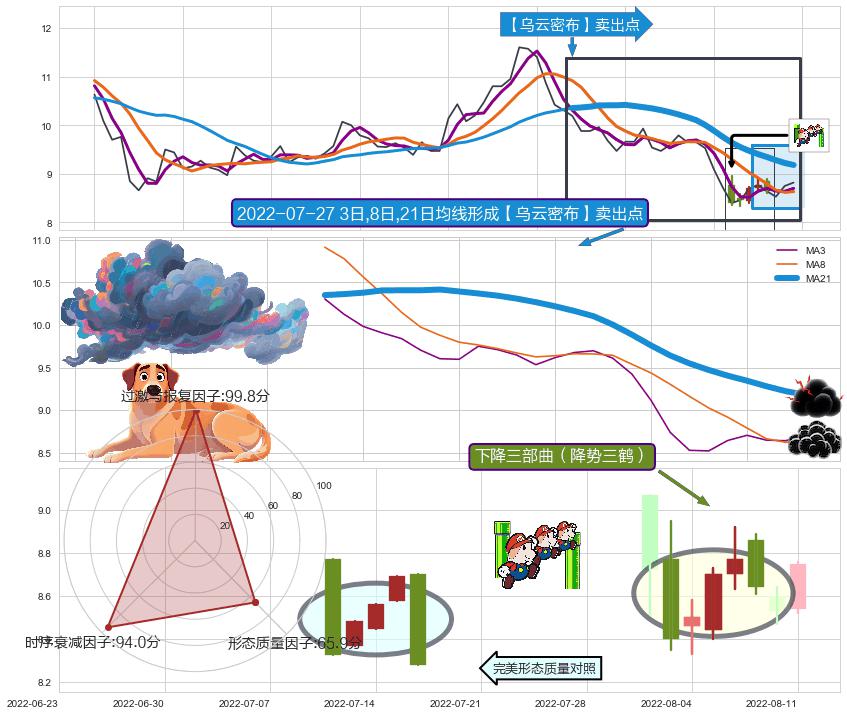 | 7 🅚:【乌云密布】卖出点 ➕ 📐:扩散三角反转下行突破支撑位破位, 猜想持续下沉下跌,被突破的支撑位已变为阻力位 ☞ 看空信号 ⇥ 【均线】交织【图形】⇥ 综合量化分数: 48 | > |