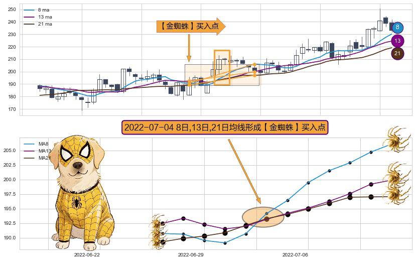 ⚀ 2022-07-04日显现 8日-13日-21日均线 【金蜘蛛】买入点 看多信号,后市看涨,买入