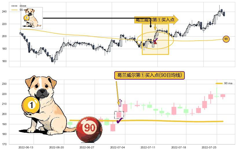 ⚀ 2022-07-01-日显现 葛兰威尔均线 90日均线 第买①入点 走势反转见底信号,后市看涨,买进信号