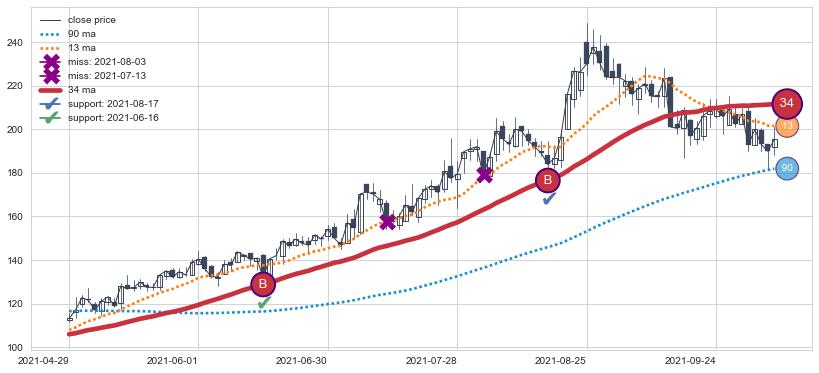 2021-04-29至2021-10-14 慢线与快线呈多头排列, 慢线与快线接触少,无缠绕