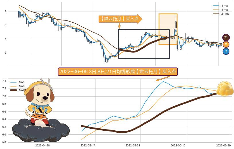 形态多维评估: ⚀ 2022-05-12日-2022-06-27日显现 3日-8日-21日均线 【烘云托月】买入点 看多信号,后市看涨,买入