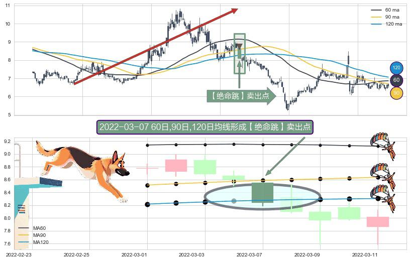 形态多维评估: ⚀ 2022-03-07日显现 60日-90日-120日均线 【绝命跳】卖出点 看空信号,后市看跌,卖出