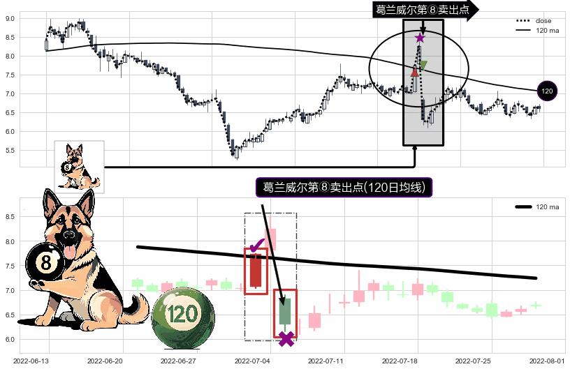 形态多维评估: ⚀ 2022-07-05-日显现 葛兰威尔均线 120日均线 第⑧卖出点 下降趋势的中继信号,后市看跌,卖出信号
