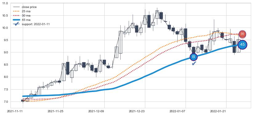 上涨趋势2021-11-11-2022-01-26,均线45确认关键支撑1处
