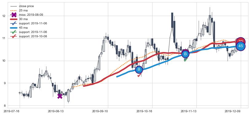 上涨趋势2019-07-16-2019-12-09,均线45, 30确认关键支撑2处