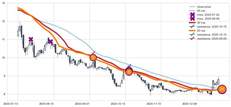 下跌趋势2020-07-13-2020-12-24,均线25, 30确认关键阻力2处