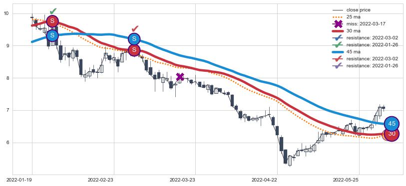 下跌趋势2022-01-19-2022-06-02,均线45, 30确认关键阻力2处