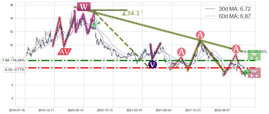 ♘ 阻力价格位7.68,可信任强度75.65%,距离最后交易2022-08-12形成的收盘价格6.60相差 +16.34%