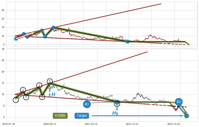 ➢ 最小反转跌幅→𝐇: 6.06 (逐步抬高阻力斜边最后的阻力点⑥与支撑边垂直距离)