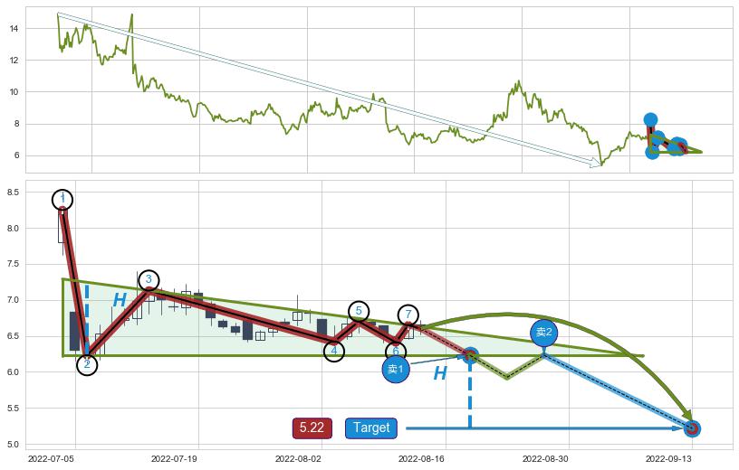 ➣ 【未确认突破,预测即将形成突破】下降三角形整理起点:2022-07-04, 预测突破点:2022-08-18,形态共34交易日