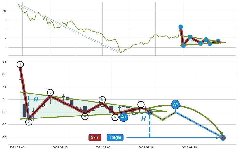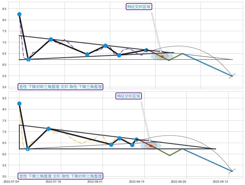 ➣ 【未确认突破,预测即将形成突破】下降【对称】三角形整理起点:2022-07-04, 预测突破点:2022-08-15,形态共31交易日