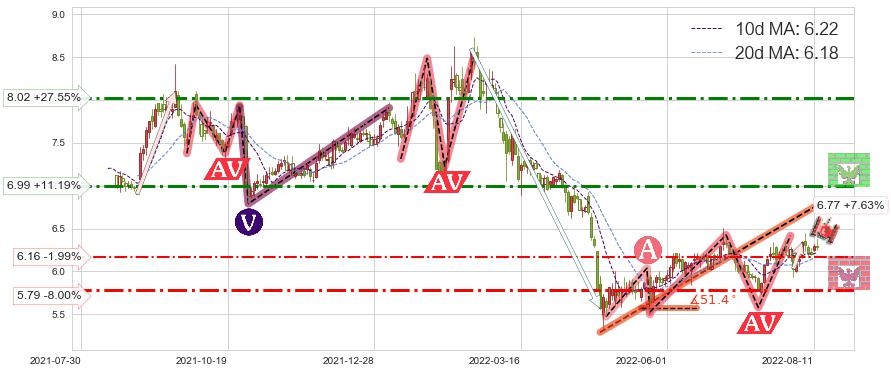 ♘ 阻力价格位8.02,可信任强度69.47%,距离最后交易2022-08-12形成的收盘价格6.29相差 +27.55%
