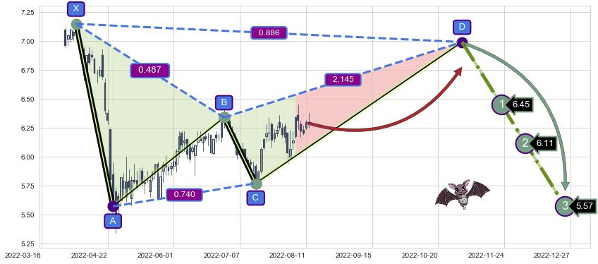 ➣ 未完成【蝙蝠】形态起点X: 2022-04-06, 已到达C点: 2022-07-15, 预测最终D点: 2022-11-02, 共142交易日