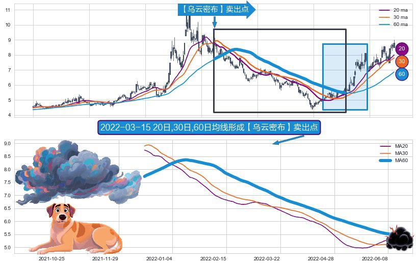 ⚀ 2021-12-15日-2022-06-13日显现 20日-30日-60日均线 【乌云密布】卖出点 看空信号,后市看跌,卖出