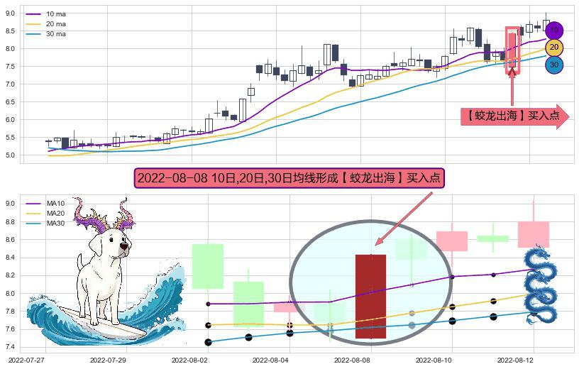 ⚀ 2022-08-08日显现 10日-20日-30日均线 【蛟龙出海】买入点 看多信号,后市看涨,买入