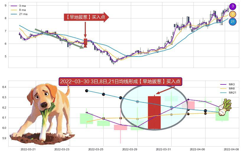 ⚀ 2022-03-30日显现 3日-8日-21日均线 【旱地拔葱】买入点 看多信号,后市看涨,买入