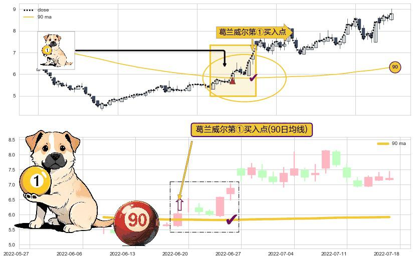 ⚀ 2022-06-17-日显现 葛兰威尔均线 90日均线 第买①入点 走势反转见底信号,后市看涨,买进信号