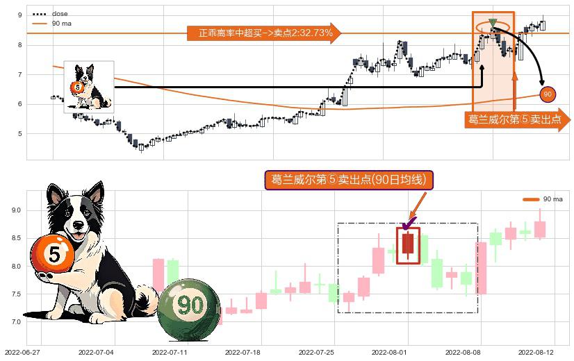 ⚀ 2022-08-01-日显现 葛兰威尔均线 90日均线 第⑤卖出点 上升趋势均值回复的短线回落信号,后市看跌,卖出信号