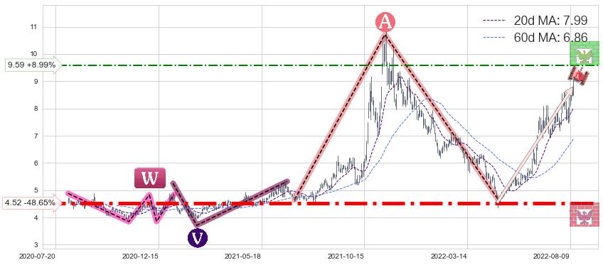 ♘ 阻力价格位9.59,可信任强度55.00%,距离最后交易2022-08-12形成的收盘价格8.80相差 +8.99%