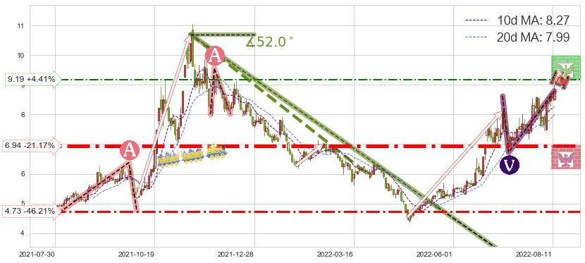 ♘ 阻力价格位9.19,可信任强度54.00%,距离最后交易2022-08-12形成的收盘价格8.80相差 +4.41%