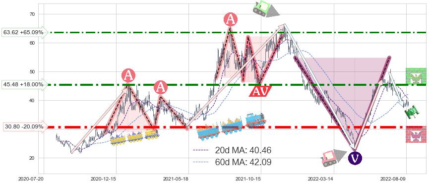 ♘ 阻力价格位45.48,可信任强度77.46%,距离最后交易2022-08-12形成的收盘价格38.54相差 +18.00%