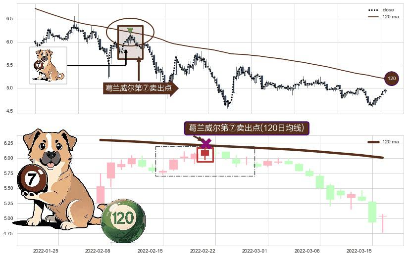 形态多维评估: ⚀ 2022-02-21-日显现 葛兰威尔均线 120日均线 第⑦卖出点 下降趋势的中继信号,后市看跌,卖出信号