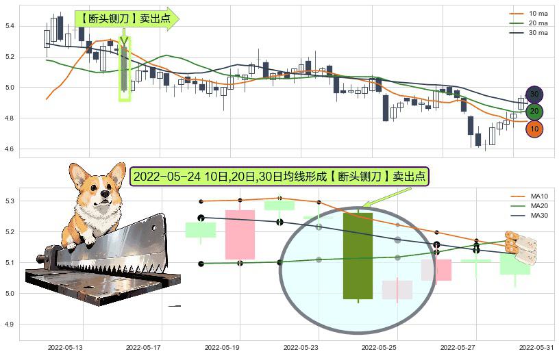 形态多维评估: ⚀ 2022-05-24日显现 10日-20日-30日均线 【断头铡刀】卖出点 看空信号,后市看跌,卖出