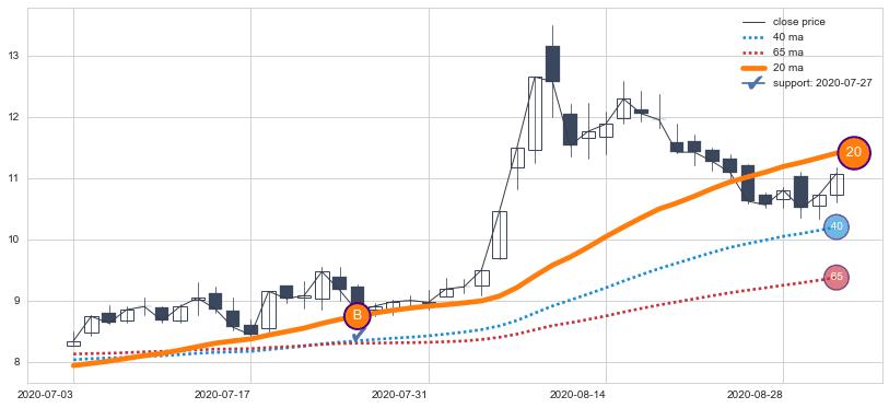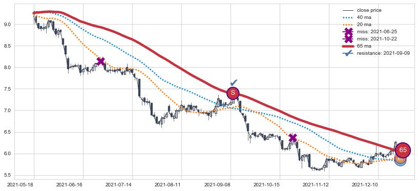 下跌趋势2022-02-08-2022-06-06,均线40, 65确认关键阻力3处