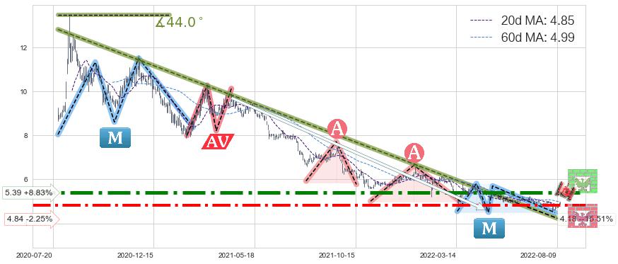 ♞ 20日均线:4.85,60日均线:4.99→ 快线<慢线