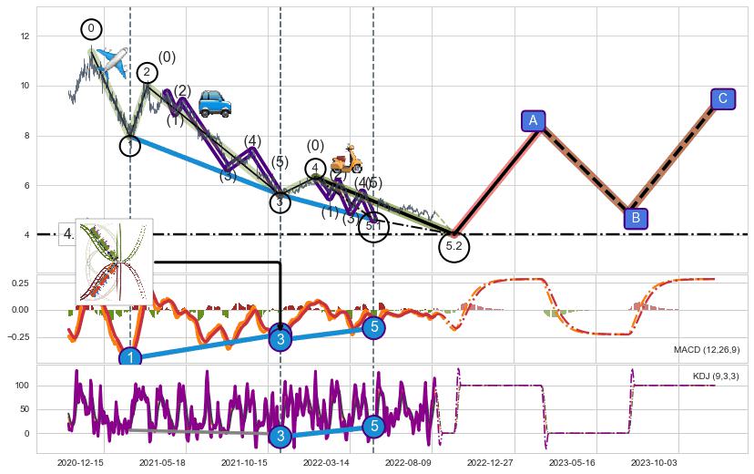 ➣ 5.1: 预测当前第5浪位置(2022-04-26, 4.62),仍然有下跌空间