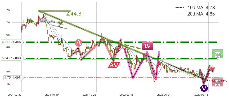 ♘ 支撑价格位4.75,可信任强度64.51%,距离最后交易2022-08-12形成的收盘价格4.95相差 -4.09%