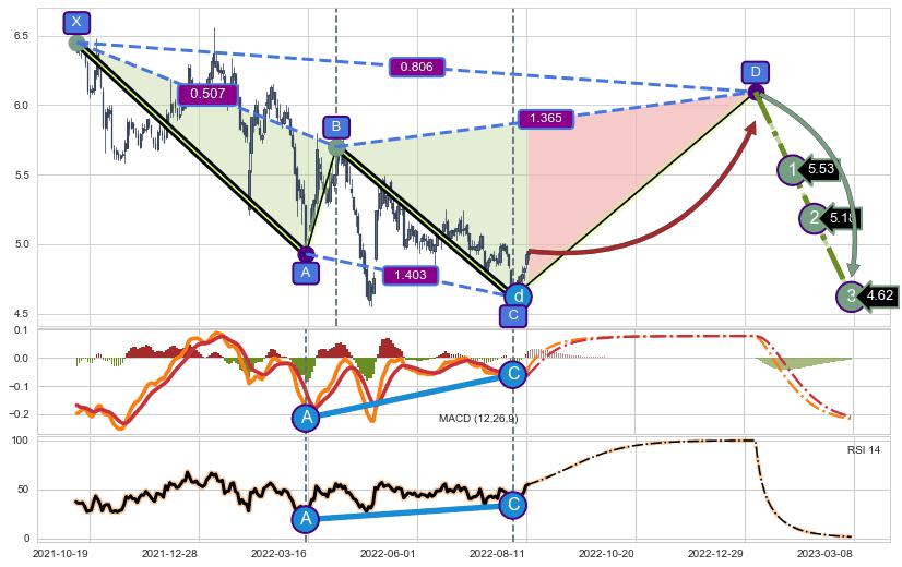 ➣ D点拟合预测价格6.09,距离最后交易收盘价格4.95相差 +23.12%