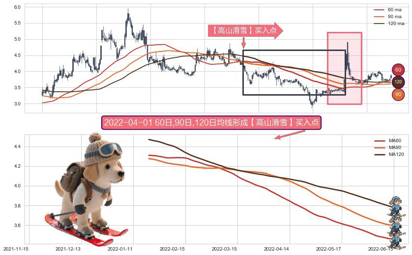 形态多维评估: ⚀ 2022-01-19日-2022-06-14日显现 60日-90日-120日均线 【高山滑雪】买入点 看多信号,后市看涨,买入