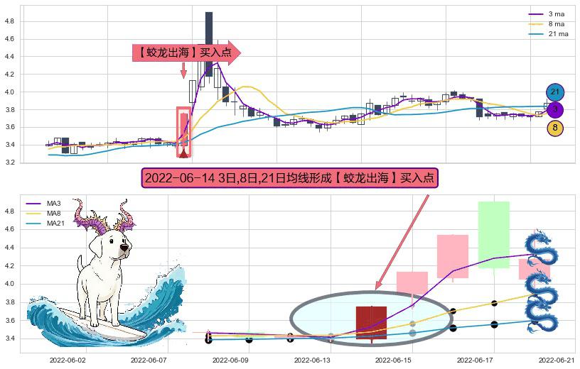 形态多维评估: ⚀ 2022-06-14日显现 3日-8日-21日均线 【蛟龙出海】买入点 看多信号,后市看涨,买入