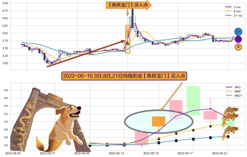 形态多维评估: ⚀ 2022-06-15日显现 3日-8日-21日均线 【鱼跃龙门】买入点 看多信号,后市看涨,买入
