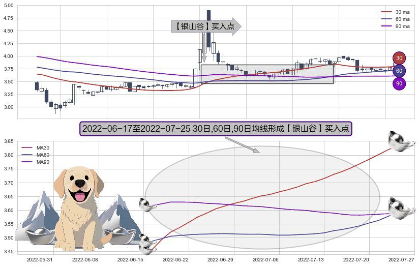 形态多维评估: ⚀ 2022-06-20-日至2022-07-25-日显现 30日-60日-90日均线 【银山谷】买入点 看多信号,后市看涨,买入