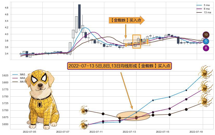 形态多维评估: ⚀ 2022-07-13日显现 5日-8日-13日均线 【金蜘蛛】买入点 看多信号,后市看涨,买入