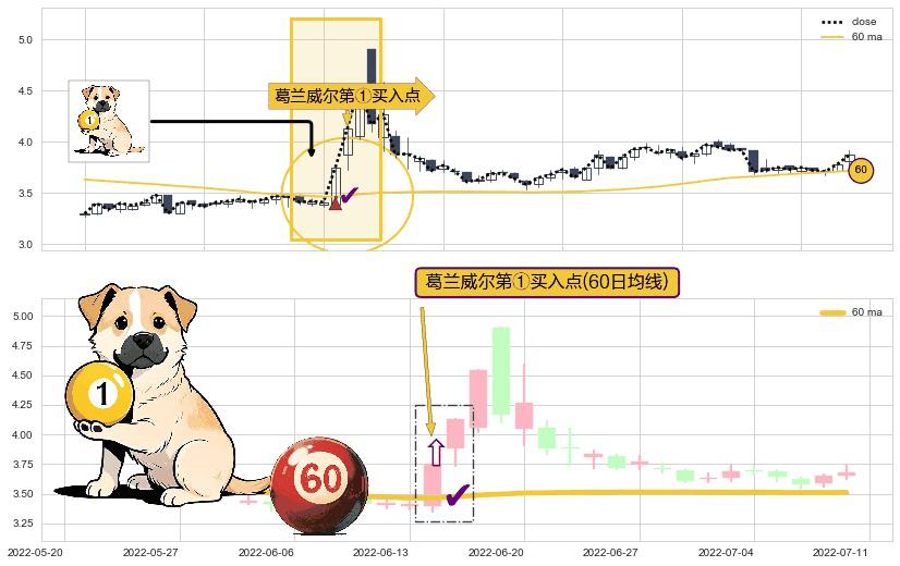 形态多维评估: ⚀ 2022-06-14-日显现 葛兰威尔均线 60日均线 第买①入点 走势反转见底信号,后市看涨,买进信号