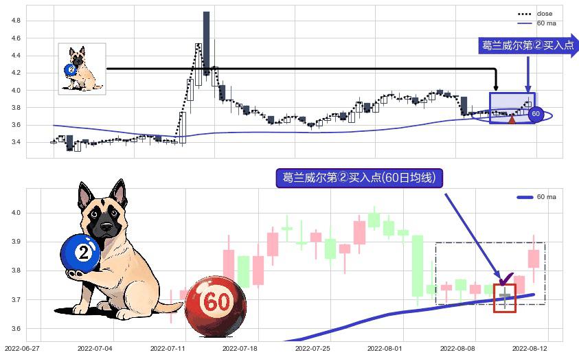 形态多维评估: ⚀ 2022-08-10-日显现 葛兰威尔均线 60日均线 第②买入点 上升趋势的中继信号,后市看涨,买进信号