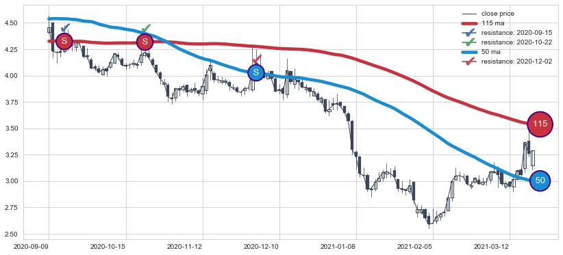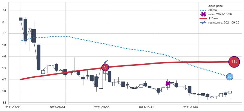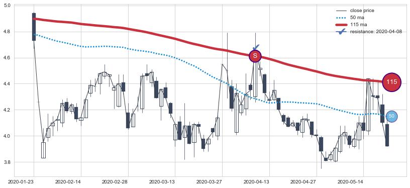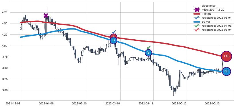 下跌趋势2021-12-08-2022-06-14,均线50, 115确认关键阻力2处